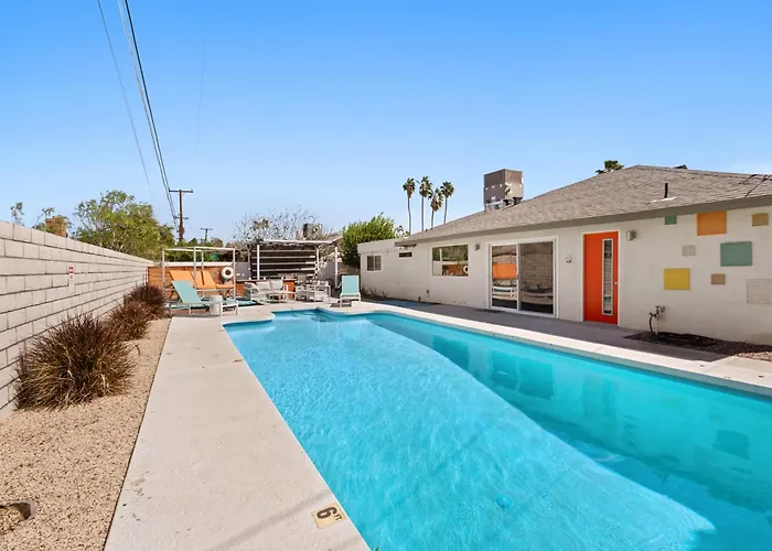 La villa Zen Space 4Bd Pool 3 Mi To Downtown Ps Palm Springs bénéficie d'un emplacement à 18 minutes à pied du Parc aquatique Wet'n'Wild Palm Springs et à 4 km de Golf Resort d'Indian Canyons. Cette villa offre également la proximité de sites naturels tels que le Parc Ocotillo, situé à 3 km.